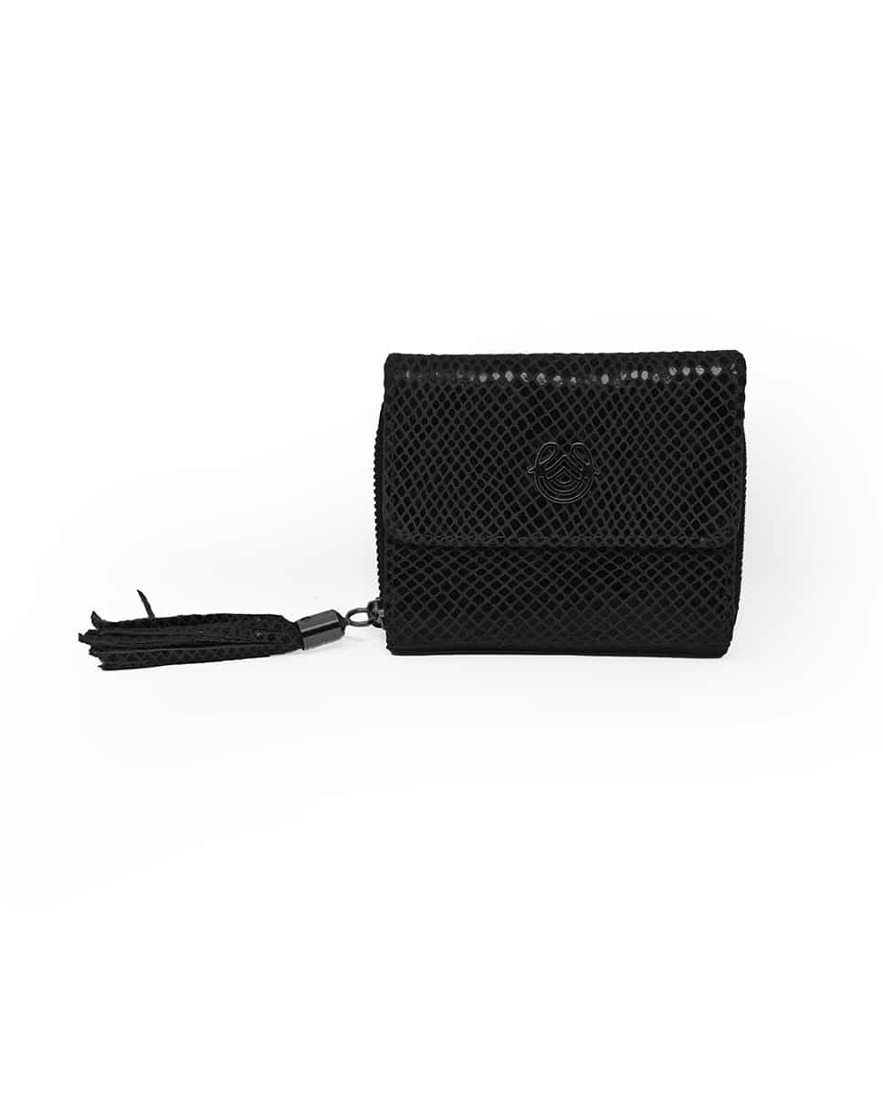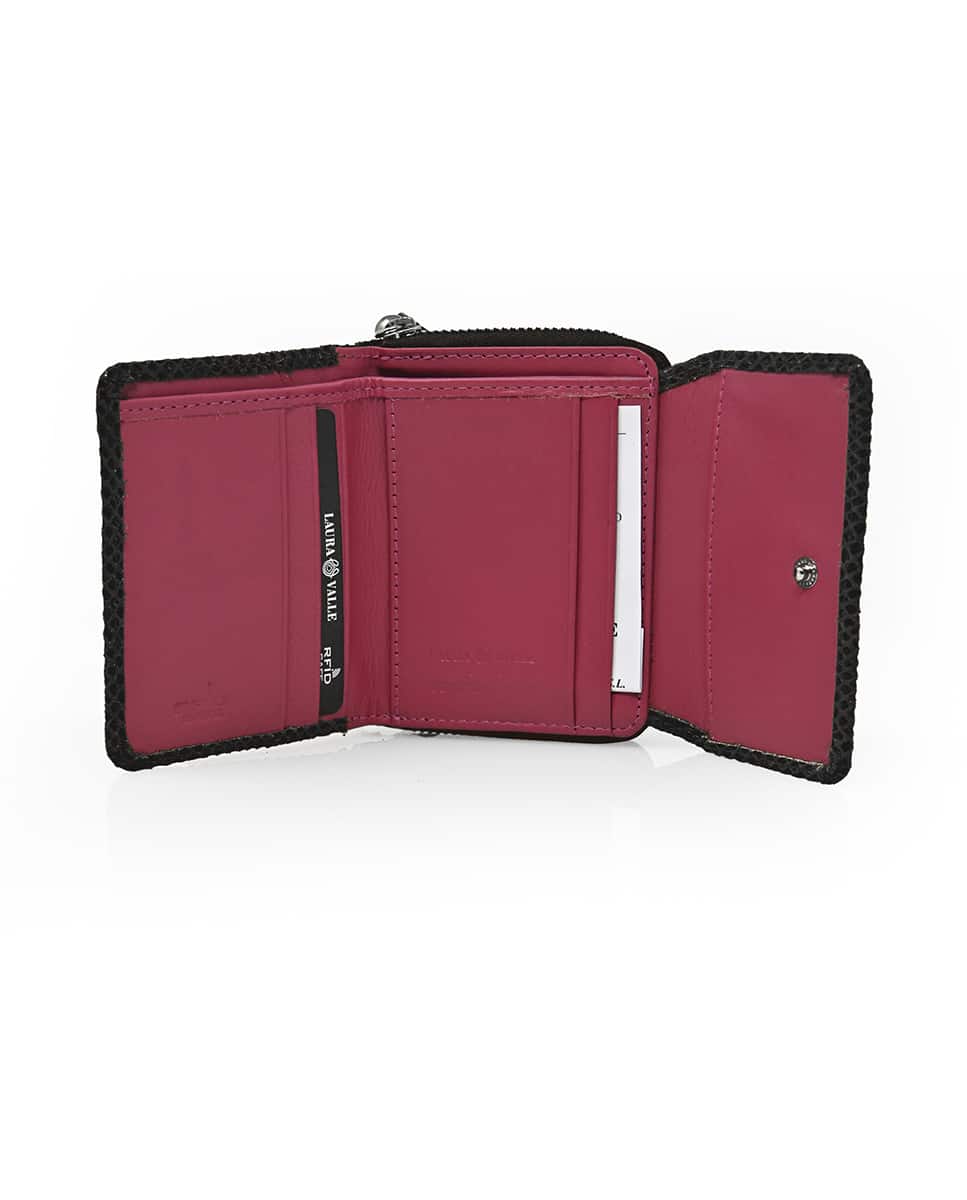 Introduciendo la cartera pequeña modelo abril de la colección Nicole de Laura Valle, un accesorio de exquisita elegancia encerrado en una forma compacta, creada con piel de vacuno meticulosamente estampada con un patrón de serpiente en un clásico y siempre elegante color negro.